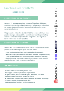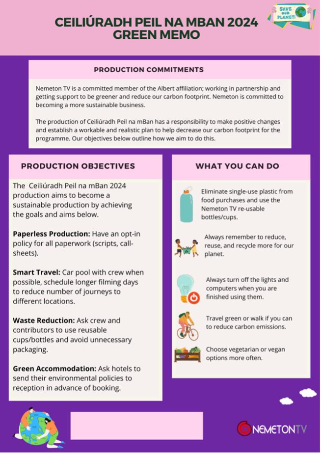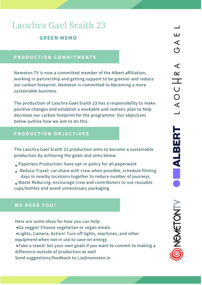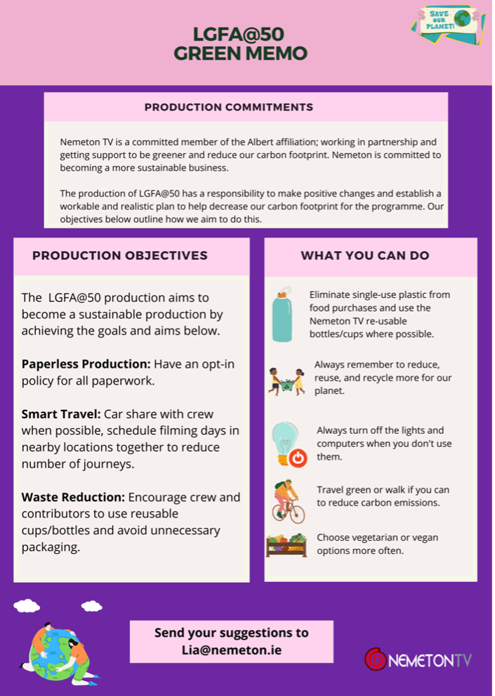There have been many new initiatives implemented in Nemeton. Having to create Green Memos prior to productions, and also draft an individual Carbon Footprint attached to each production, opens your eyes to new ways of reducing the company’s impact.
